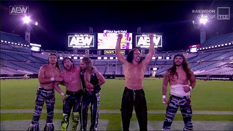 This was taped at TIAA Field Bank with a ring at the 50-yard line, Falls Count Anywhere, and No DQs. Each team is introduced by Justin Roberts, coming out like football players typically do with jerseys on. The Jacksonville Jaguars cheerleaders are out, as well. Some Inner Circle members have helmets on for their entrance. Matt Jackson had banged up his ribs on this past Wednesday and has them taped up. Page is introduced, but he doesn't immediately show up. Four referees will be involved in the match. Both teams run at each other and swing away with random weapons. Omega running with a broom. Guevara gets dropped and he turns around slowly, only to see Hangman Page on a horse. He ends up chasing Guevara right off the field. Page looking around for Sammy while everyone else battles on the field. Nick and Jericho actually do some wrestling inside the ring.